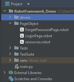 The chromedriver and geckodriver are placed in a folder name drivers in the RobotFramework_Demo project. I have renamed chromedriver to chrome and geckodriver to firefox.
