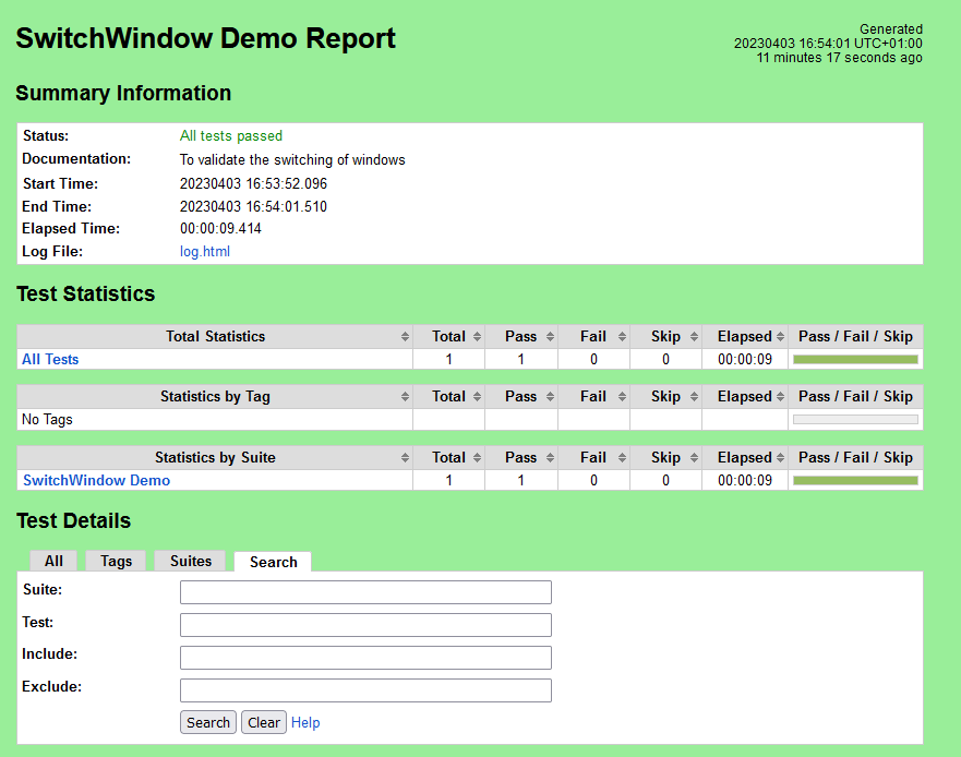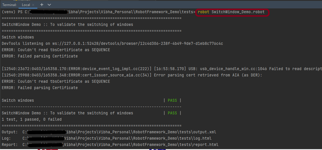 We have the test case passed. The Robot Framework generates log.html, output.xml, and report.html by default.