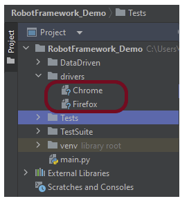 The chromedriver is placed in a folder name drivers in the RobotFramework_Demo project. I have renamed chromedriver to Chrome.