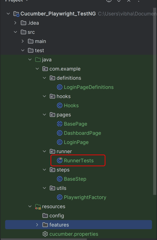 We need to create a class called Runner class to run the tests. This class will use the TestNG annotation @RunWith(), which tells TestNG what is the test runner class. TestRunner should be created under src/test/java within the folder called runner.
