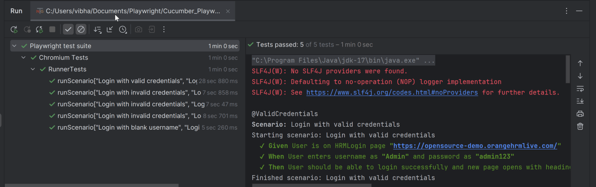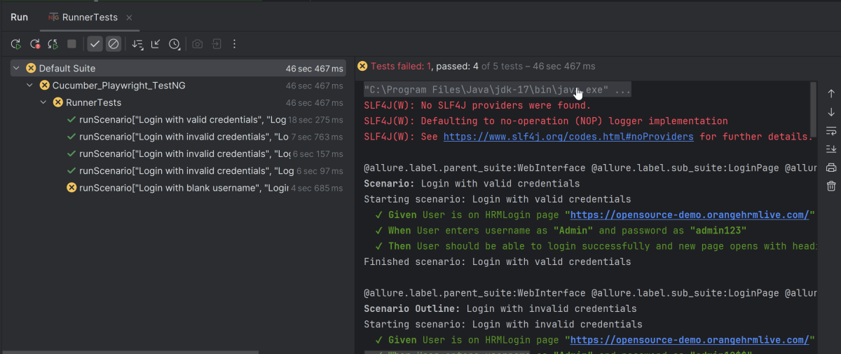 Go to the Runner class and right-click and select Run ‘RunnerTests’. The tests will run as TestNG tests (in IntelliJ).
