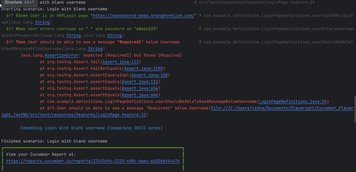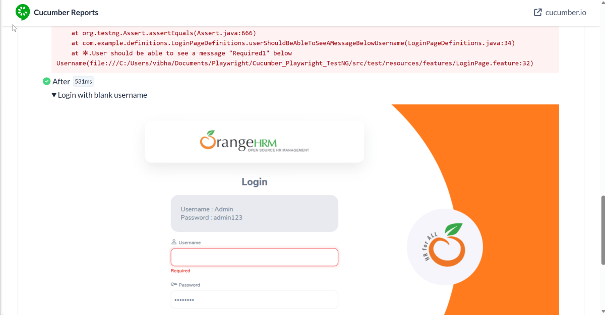 The screenshot of the failed test is also attached in the Cucumber Report.