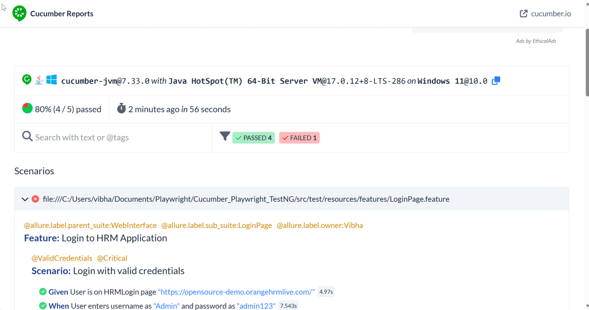 Below is the image of the Cucumber Report generated using the Cucumber Service.