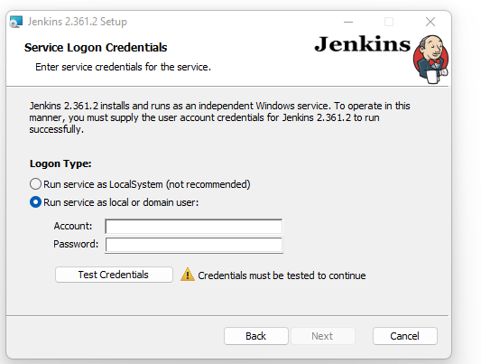To run the Jenkins service using this option, you have to enter the domain username and password. Click on the “Test Credentials” button to test your domain credentials, and you will enable the “Next” button. Then, click on the “Next” button after it appears.