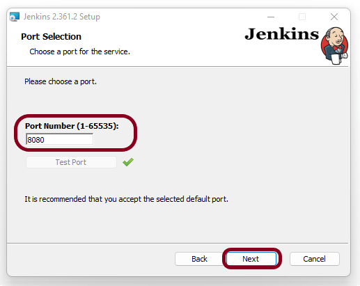 Step 6 – Enter the port on which Jenkins will be running. Click on the “Test Port” button to validate if it is free.