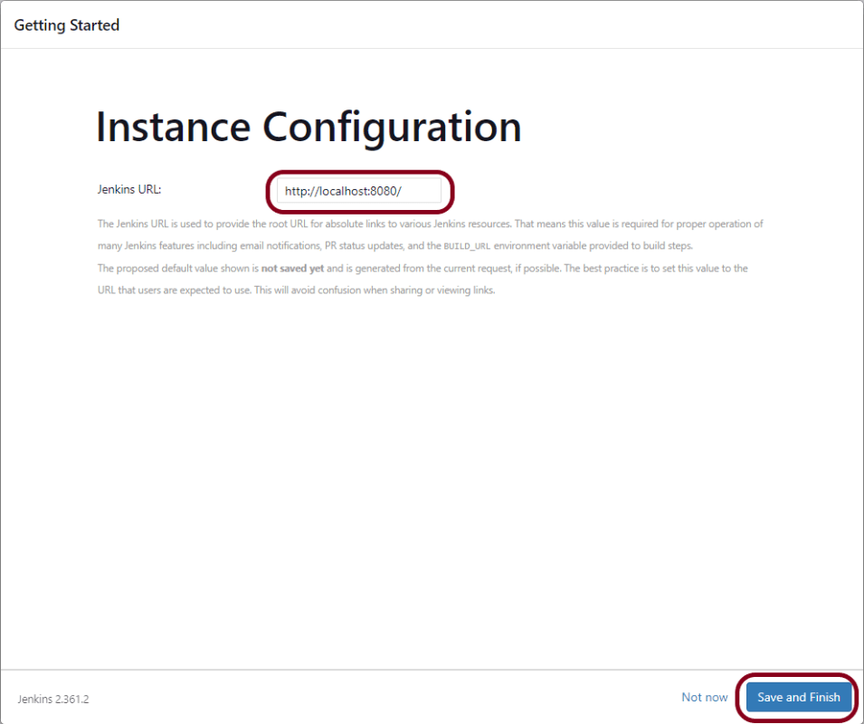 Step 6 – Click on Save and Finish to complete the Jenkins installation.